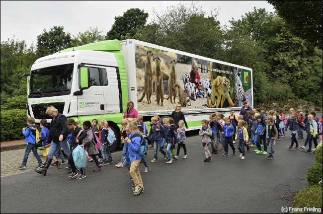 Ein neuer Lkw der Bentheimer Eisenbahn - Kraftverkehr Emsland wirbt großformatig für den Tierpark Nordhorn. |